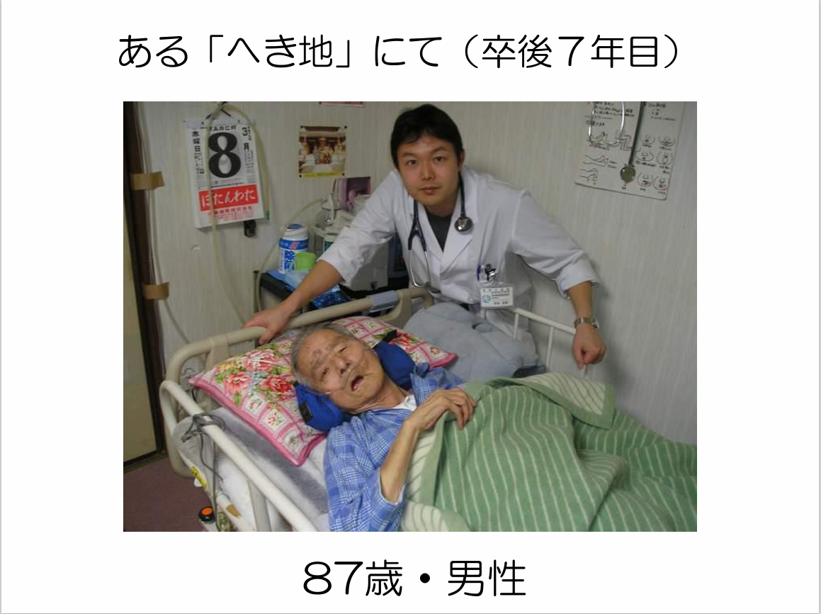 「へき地は医師をステキにする」は、三重県の神島に長く勤務された自治医科大学の大先輩、奥野正孝先生の言葉です。私も自治医科大学を卒業し、卒後7年目に派遣されたへき地は父のふるさとでした。そこで祖母と暮らす祖父は、脳梗塞後遺症による誤嚥性肺炎で入退院を繰り返し、ほぼ寝たきりで、私が主治医となりました。入院を嫌う祖父は、へき地診療所の看護師さんや訪問看護師さんのおかげで、祖母と自宅で療養を続けることができ、私が赴任してから1年後、最期を自宅で祖母と私と迎えることができました。